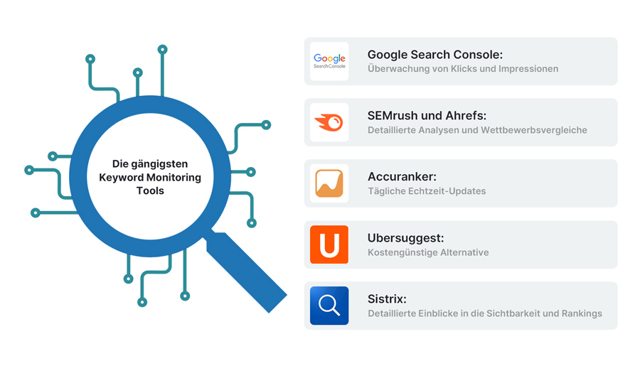 Es gibt viele Tools für das Keyword Monitoring, darunter Google Search Console, SEMrush, Ahrefs, Accuranker, Ubersuggest und Sistrix. Jedes dieser Tools bietet spezifische Funktionen und Vorteile.