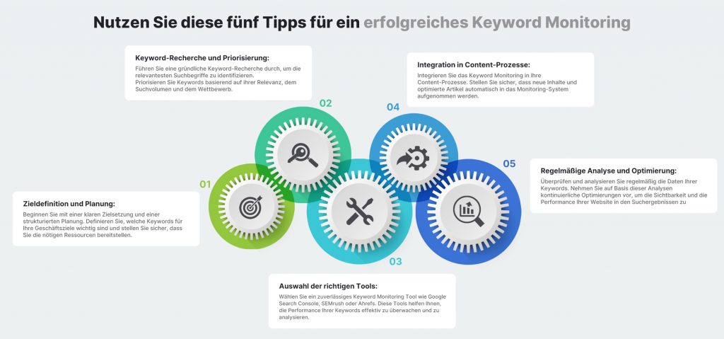 Für ein effektives Keyword Monitoring sollten Sie ein zuverlässiges SEO-Tool auswählen und die Anzahl der zu überwachenden Keywords begrenzen. Konzentrieren Sie sich auf die wichtigsten Suchbegriffe pro URL oder Artikel, um einen klaren Überblick zu behalten.