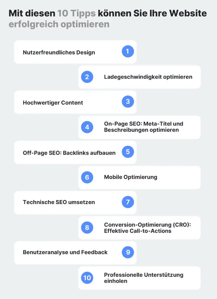 Man kann Websites optimieren, indem man SEO-Maßnahmen, technische Verbesserungen und benutzerfreundliche Designs implementiert. Regelmäßige Inhaltsaktualisierungen und die Nutzung von Analyse-Tools sind ebenfalls wichtig.